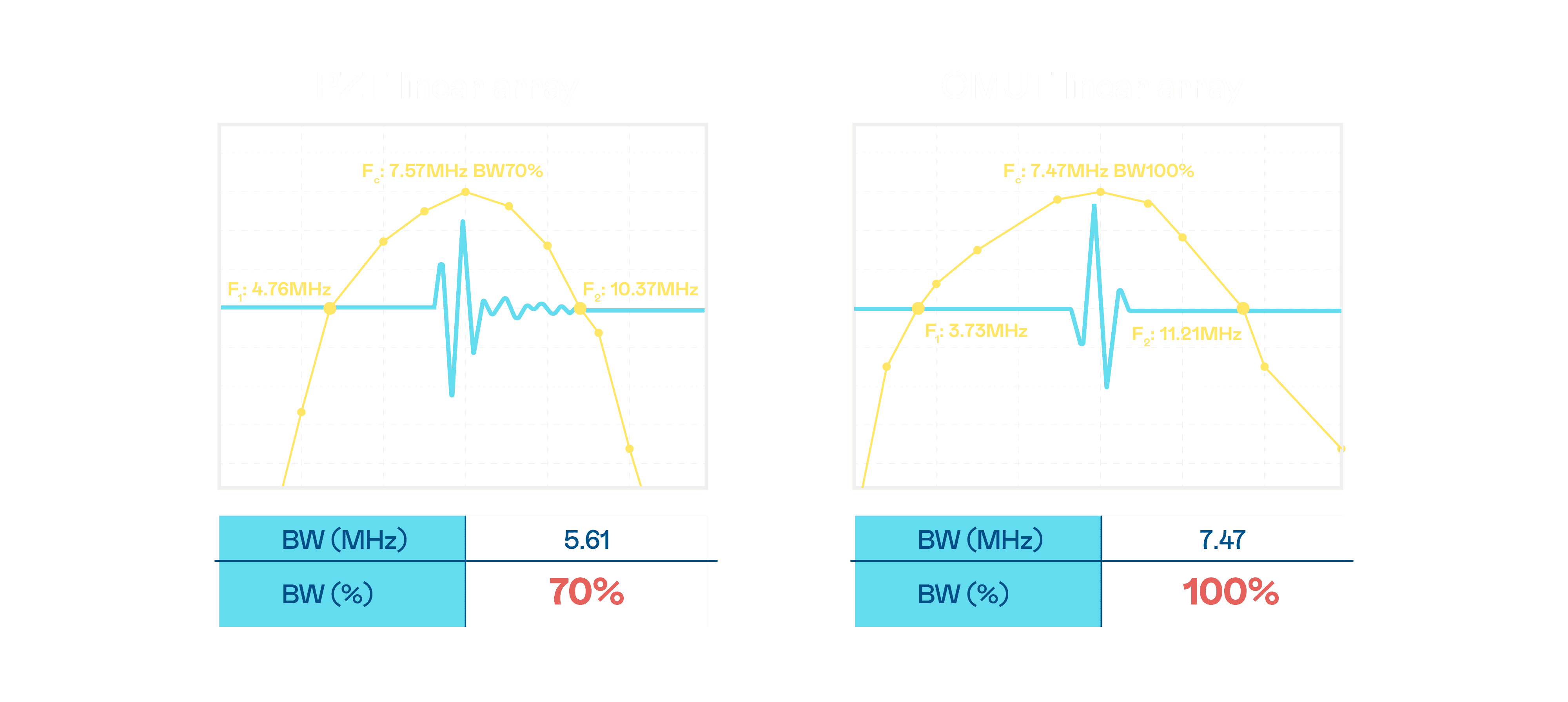 超音波影像的解析度高低,,,首先取决于探头能发出的讯号频宽。。。。尊龙z6 CMUT 可提供高清晰的超音波讯号,,提供高频宽、、、、高灵敏度、、、影像纹理细节更高的超音波影像,,,协助医护人员缩短影像判读时间及利用精准的医疗影像进行诊断。。